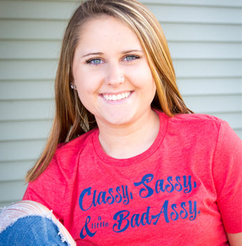 This women's relaxed cut t-shirt is a fun red with blue writing. Looks great with denim.