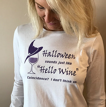Halloween sounds just like "Hello Wine" Available in long sleeve or women's slim cut.